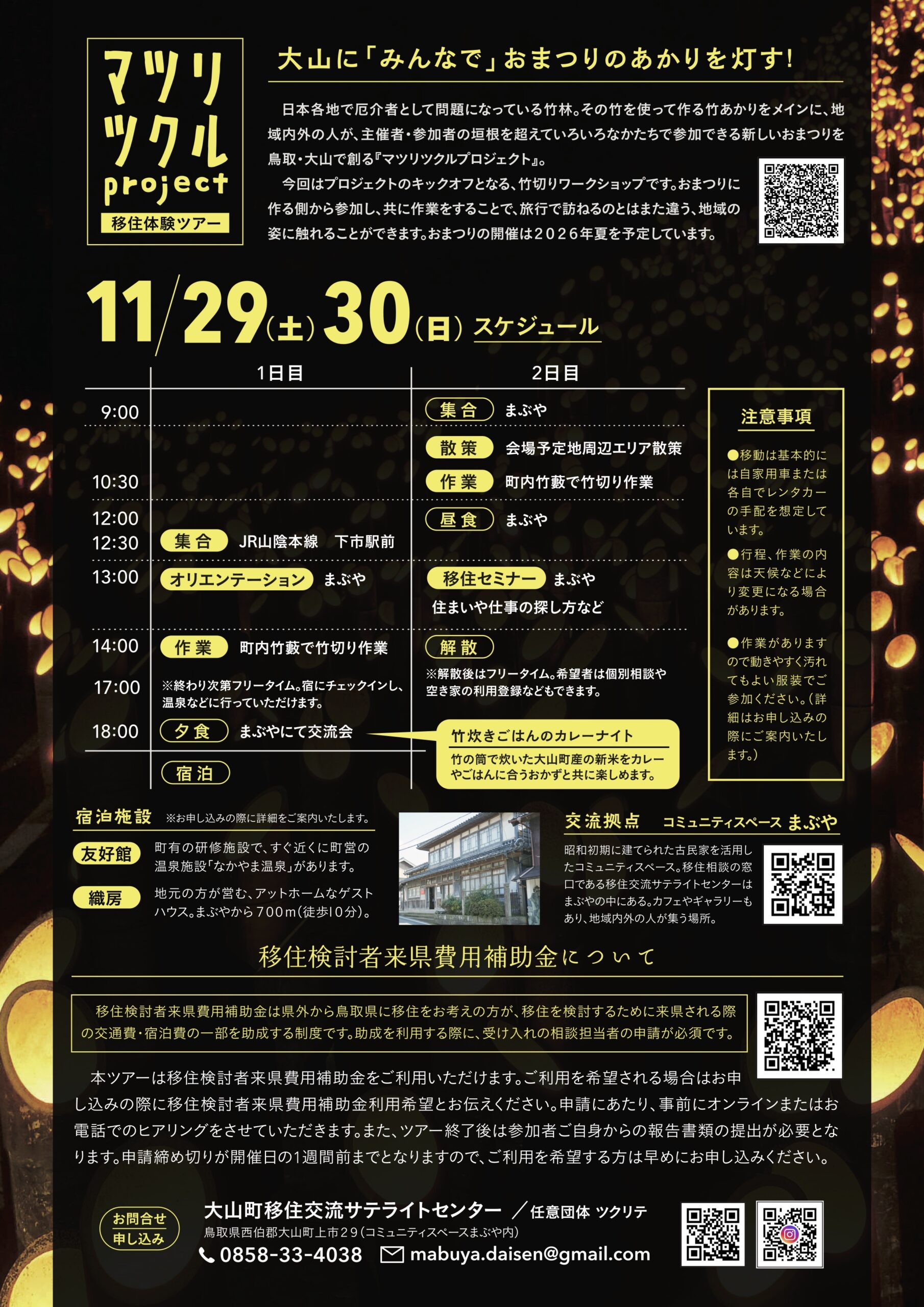 日本各地で厄介者となっている竹林。その竹林の竹を使って竹あかりを作り大山の夏を盛り上げる「マツリツクルproject」そのキックオフである「竹切り」に参加していただきます。